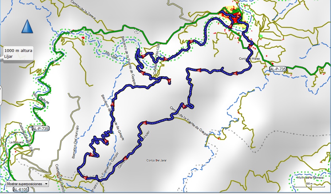 Partiendo desde el municipio de Lijar, iniciamos el sendero en el río Tahalí para coger un antiguo camino empedrado por el que vamos ascendiendo continuamente hasta alcanzar la cota máxima del sendero, 985 metros, un excepcional mirador natural. A partir de aquí iniciamos el descenso hacia la antigua cortijada de la Fuente de Gaspar, pasaremos cerca de la Cueva del moro, el lugar denominado el Castillico, hasta llegar a las huertecillas bajas, lugar con abundante vegetación. Desde aquí salimos de nuevo al Río Tahalí hasta el pueblo.