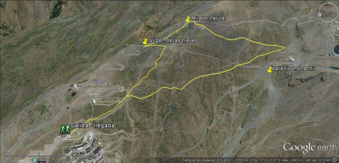 La ruta parte del parking "Los peñones", a 2370 metros de altitud, para coger enseguida la pista de esquí de fondo "puerta de Elvira". Durante el tramo de ida en dirección a borreguiles, disfrutaremos de unas impresionantes vistas del valle del rio Monachil, por donde hoy discurre la pista "el rio"y de la loma de Dílar. Llegamos al telesilla Stadium (1 hora) donde nos espera lo más duro de la jornada; subir por la pista "Ribera del Genil" hasta el mirador natural del valle de San Juan (2660), donde nos espera una impresionante panorámica del mismo, de la cara norte del veleta y de los mayores picos de sierra nevada en general.